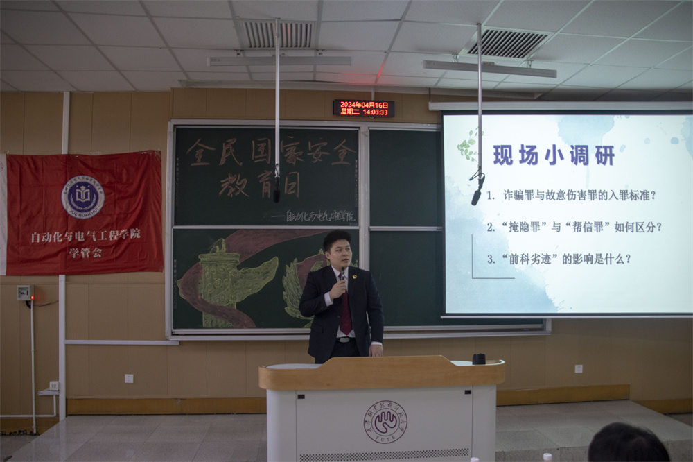 弛天培以《面明法制灯塔,保卫安然校园》为题,联合年夜教死身旁案例,深刻浅出天讲授了执法条则,传授教死怎样辨别战应付百般欺骗疑息战成心损害环境,活泼天道述了“以工资原、人命至上”的平安理想,并便青年年夜教死怎样踊跃建设